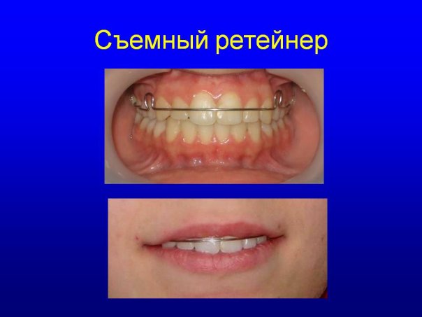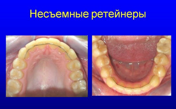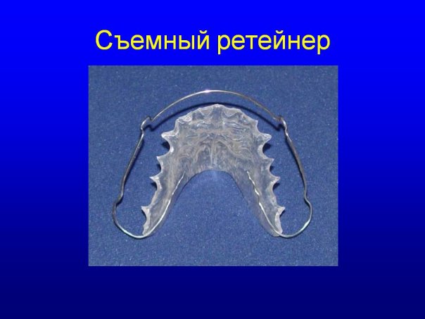 Включает в себя: - приклеивание закрепляющего результат ретейнера с внутренней стороны зубов (от клыка до клыка); - снятие брекетов с верхних и нижних зубов; - профессиональная гигиену (снятие остатков клея, зубных налётов, полировку и эмалевую герметизацию зубов); - снятие слепков, изготовление гипсовых моделей и фотографий конца лечения; - изготовление закрепляющих результат ночных съёмных пластинок или капп на верхнюю и нижнюю челюсти